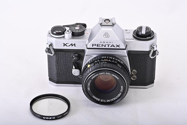 full mechanical SLR body with standard prime lens SMC Pentax-M 1:2/50mm and UV filter, normal signs of use (B), in good working order, CLA 09/25 incl. new light seal