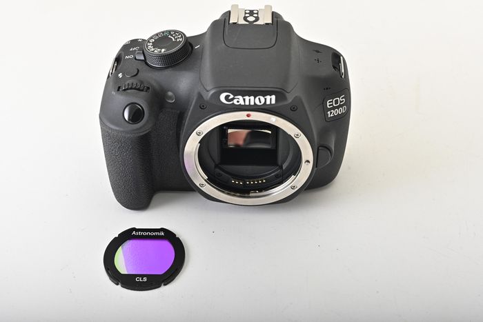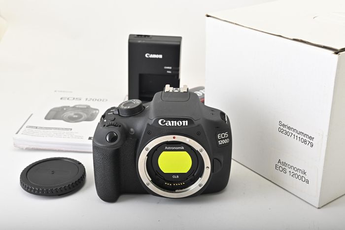 modified EOS 1200D for Astronomic long exposure with MCL filter and CLS Clip filter, with cap, battery, charger, strap, instructions and box - INFO: astronomik.com