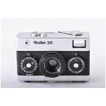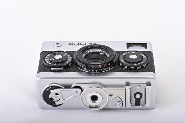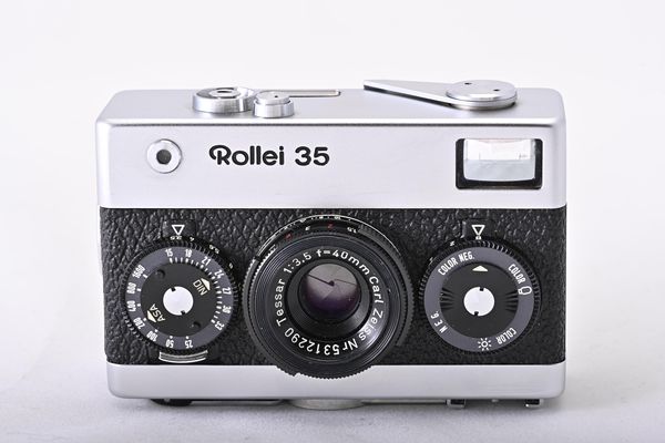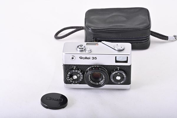 Rollei 35 chrome made in Germany with Carl Zeiss Tessar 3.5/40mm Nr 5312290, with original wrist strap, cap and soft-case, mint condition (A-)