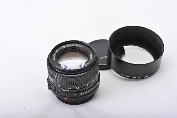 Canon Lens FD 50mm 1:1.4, with lens hood BS-52 and caps, in very good shape (B/A)
