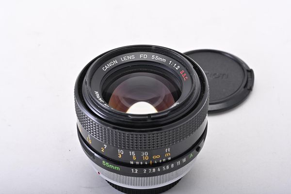 high performance Canon FD lens 55mm 1:1.2 S.S.C., clean lenses, no scratches, smooth focusing, with caps, lens barrel with normal signs of use (B)