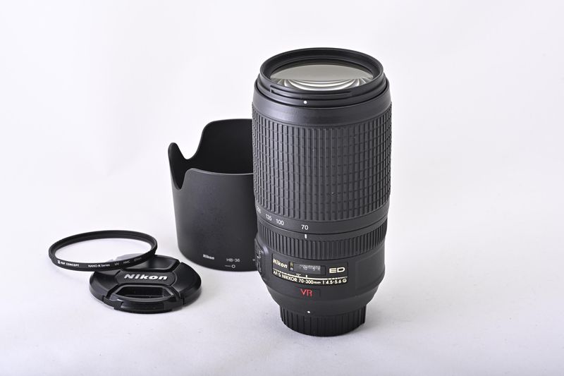 Nikon ED AF-S NIKKOR 70-300mm 1:4,5-5,6G VR, with caps, lens hood HB-36 and UV filter, in near mint condition (A-)