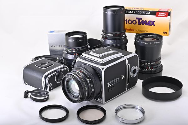 500 C/M outfit in near mint condition (A/B) and good working order. Zeiss C Planar 3,5/100mm T* Zeiss C Distagon 4/50mm T* Zeiss C Sonnar 4/150mm T* Zeiss C Sonnar 5,5/250mm T* Extension tube 32 and 21 Winding Knob and winding crank Waist level-finder 2 focusing screens A12 magazine 6x6cm A24 magazine 6x6cm Polaroid magazine 100 Shoulder strap long Metal lens hood 50 and 150 Various filters
