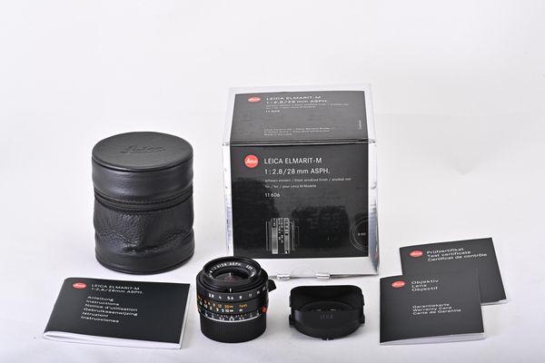 Leica Elmarit-M 2.8/28mm ASPH., black anodized finish 11606, 6-bit, with lens hood, rear cap, case, instructions, test certificate, warranty card and makers box, mint condition (A-)