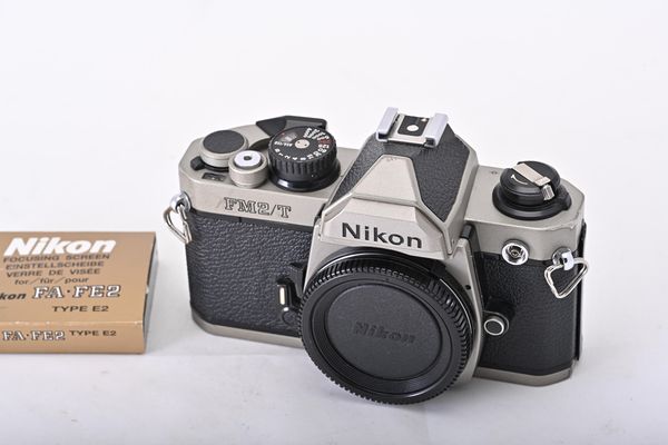 Nikon FM2/T (Titan) body with instructions, cap, focusing screen 1x grid- and 1x split image, in good working order and with normal signs of use (B-)