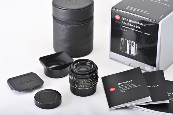 Leica Summicron-M 2/35 ASPH. 6-bit, 11673 black anodized finish, in mint condition (A-), complete with lens hood 12470, all caps, leather case, instructions, warranty card, test certificate and makers box, Germany c2021